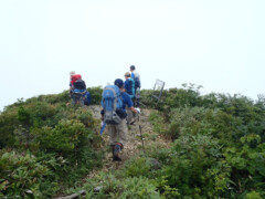 登り:栂海新道登山口―(3時間)―尻高山山頂―(40分)―坂田峠―(3時間)―白鳥山山頂―(1時間30分)―菊石山山頂―(2時間30分)―犬ヶ岳山頂―(1時間30分)―サワガニ山―(1時間30分)―黒岩山山頂所要時間:13時間40分